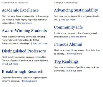Aber nicht nur darauf ist Emory stolz.  Einen Überblick über all die vielen verschiedenen Ranking findet man hier – natürlich im Kapitel Points of Pride.