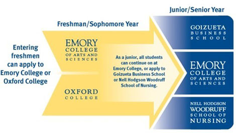 An diesem Bild kann man schon Vieles ablesen: die undergraduate education an Emory dauert grundsätzlich vier Jahre, wobei StudentInnen die Möglichkeit haben, nach 2 Jahren zwischen „Zweigen“ zu wählen, um sich zu spezialisieren. Diese beiden Jahre enden mit einem sogenannten AA-Degree (Associate Degree) und berechtigen letztlich auch Oxford College StudentInnen, ihre Ausbildung an Emory fortzusetzen.