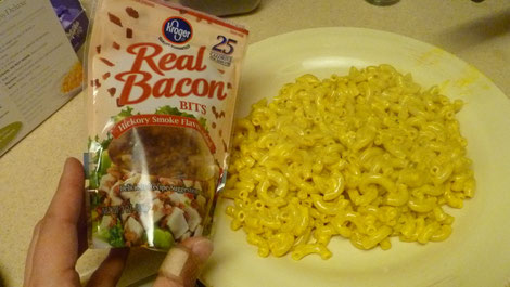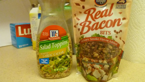 Wer es deftiger mag und keine Zeit hat, "richtigen" Bacon zu braten, kann auf Bacon Bits zurückgreifen. Zwar nicht so gut wie unsere Speckwürfel, aber sie verleihen so mancher Speise das gewisse Etwas. - Wer sich wundert, warum auf der Verpackung "Real" steht ... es gibt sie auch in einer Fake - Version. Dann schmecken sie zwar nach Bacon, es ist aber rein gar kein Fleisch drin ... ??? So ist das in Amerika, aber das werdet ihr schon noch sehen!!