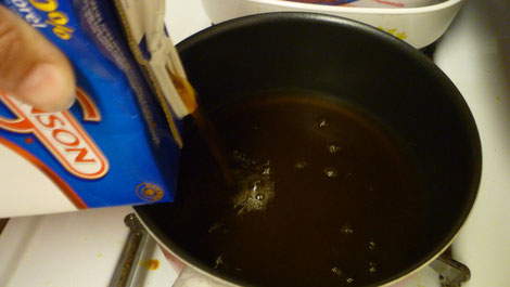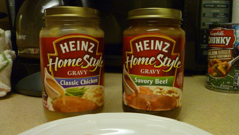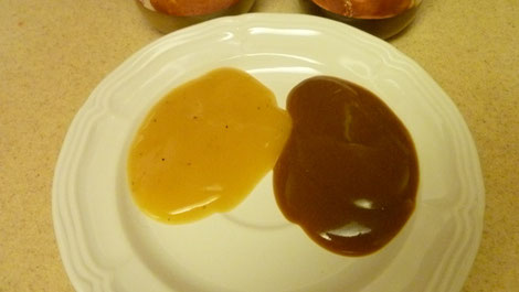 Aufgrund des vielen Wassers ist es kaum möglich, einen wirklich guten Bratensaft hinzubekommen ... aber das macht nix, denn dafür gibt es Sauce, hier Gravy genannt, aus dem Glas - in allen denkbaren Geschmacksrichtungen.