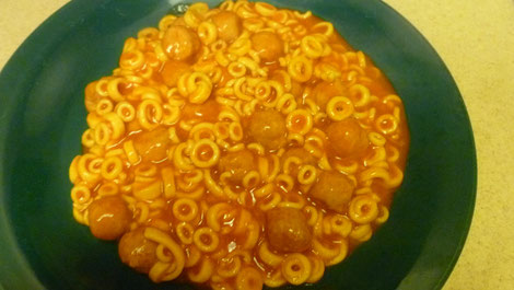Hier kommt ein angeblicher Klassiker für Kinder ... viele haben mir erzählt, dass sie Spaghettios als Kinder gebliebt haben. Spannend ist nur, dass sie sie seitdem nicht mehr gegessen haben und ich kann mich nicht vorstellen, dass auch nur eine/r unter ihnen, sie immer noch lieben ... denn ich habs nicht geschafft, die Portion auszuessen ... pfui!!
