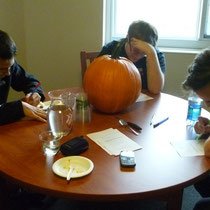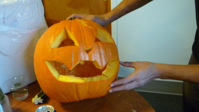 Und wir haben nicht nur Kürbis gegessen und getrunken,sondern auch zwei wirklich tolle Halloweenkürbisse geschnitzt, die ab nächster Woche unser Department schmücken werden.