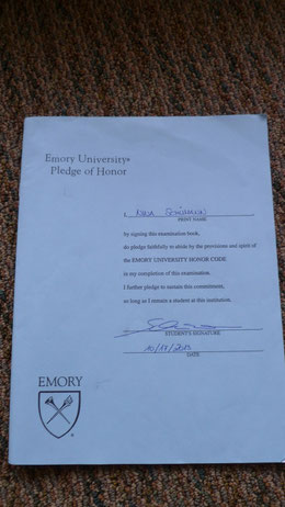 Ganz wichtig dabei ist natürlich der Honor Code, denn geschummelt darf hier nicht werden. Aber letztlich glaube ich nicht, dass es nur darum geht, mit diesem Heft die Relevanz des Codes zu unterstreichen, sondern vielmehr ist es eine nette Sache, um wieder mal Geld zu verdienen. So kosten 6 Seiten einen ganzen Dollar … Und das Schummeln ist damit wirklich nicht beseitigt, denn obwohl ich mir habe sagen lassen, dass Ehrlichkeit hier wirklich groß geschrieben wird, es kann mir keiner erzählen, dass StudentInnen, die während der Prüfung den Raum verlassen – worüber sich übrigens niemand Sorgen zu machen scheint – nicht zumindest zum Teil die Chance nutzen :-).