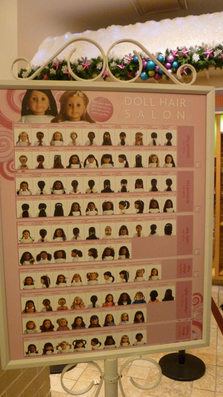 gibt es hier ein Geschäft, in dem wir aus dem Staunen nicht mehr herausgekommen sind – American Girl. Und hier werden nicht einfach Puppen verkauft … Nein! Hier sucht man sich seine Puppe aus: grüne Augen, blond, mit Stirnfransen, aber ohne Sommersprossen oder doch mit schwarzen langen Locken und Brille. Und dann geht’s erst richtig los, denn für jede Gelegenheit gibt’s die passende Ausrüstung: vom Abendkleid über Sportkleidung bis hin zum Schul- und Schlafgewand. Aber das reicht noch nicht, denn Isabelle, Caroline, … (oder wie sie alle heißen) brauchen schließlich auch ihren Schianzug und ihr Snowboard im Winter und die komplette Campingausrüstung im Sommer. Und das Beste: viele der Kleider gibt es auch in Lebensgröße für die Puppenbesitzerinnen.
