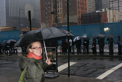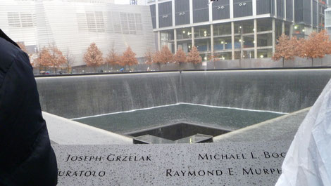Zurück in Manhattan hat uns der Weg durch den financial district zum World Trade Center Memorial geführt – und das im strömenden Regen :-(. Viel beeindruckender als das Memorial selbst war aber das Tribute Center, wo Fundstücke, Filme, Tonbandaufnahmen, Fotos und unzählige Vermisstenanzeigen den Anschlag vom 11. September dokumentieren. Wir waren tief berührt und beinahe den Tränen nahe. Ich glaube v.a. deswegen, weil wir uns selbst noch so gut an diesen Tag und all unsere Empfindungen erinnern können. Und während wir all das von so weit weg erlebt haben, können wir uns, so glaube ich, nicht einmal im Ansatz vorstellen, was dieser Tag im Leben der AmerikanerInnen und besonders New YorkerInnen verlaufen sein muss …