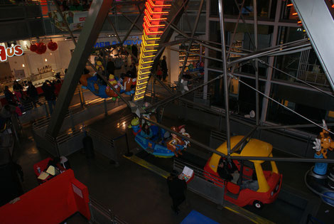 Besonders Kinderherzen und die verspielter Erwachsener, wie wir es sind, schlagen hier höher … So gibt es im Toys’R’us am Times Square ein Riesenrad, das über alle drei Verkaufsstöcke reicht.