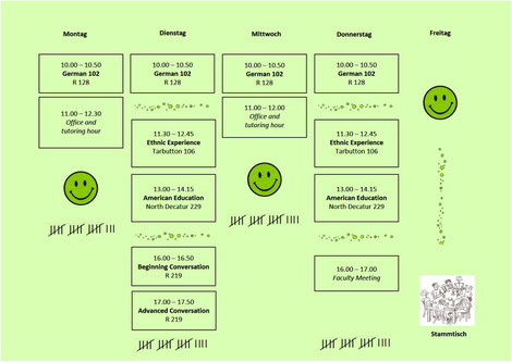 Wie im letzten Semester unterrichte ich wieder drei Klassen, besuche zwei Kurse und neben Sprechstunden und einem wöchentlichen Meeting konnte ich glücklicherweise auch meinen freien Freitag behalten :-).