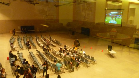 Und ich war richtig aufgeregt, denn das sollte nicht nur mein erster, sondern wahrscheinlich auch mein letzter Super Bowl sein, den ich nicht nachts oder gar nur zeitversetzt am nächsten Tag sehen konnte. Leider fand ich niemanden, der meine (stille) Begeisterung für Football teilt und mich in eine Sportsbar begleiten wollte und so entschied ich, da ich ja alleine war, mich mit der in dem benachbarten SAAC stattfindenden Stundenten-Super Bowl-Party zufrieden zu geben. Und so war ich um 6 auch bereit, die Wohnung zu verlassen und mich dem Fantum hinzugeben, wenn auch noch unschlüssig, zu welcher Mannschaft ich halten sollte. Denn die letzten Jahre haben gezeigt, dass stets die Mannschaft gewonnen hat, zu der ich nicht gehalten habe und so stand ich auch dieses Jahr wieder vor der schwierigen Aufgabe … Aber diese Aufregung und Vorfreude sollte nicht lang anhalten, denn als ich die für ein public screening umgewandelte Sporthalle betrat, war mir sofort klar, dass ich hier nicht jenen Wahnsinn sehen würde, den ich mir von Amerika beim Super Bowl erwartet hatte.