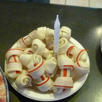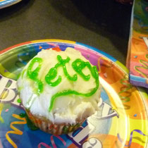 Während wir Menschen gute selbstgestaltete Cupcakes genossen haben, hat Peter auch seine eigene "Torte" bekommen. Schon spannend, dass man sogar für Hunde backen kann ... Und weil es hier offenbar dazugehört, mussten wir alle auch Geburtstagshüte tragen. Ich hätte mir nur gewünscht, dass Peter das auch zu schätzen gewusst hätte :-)).