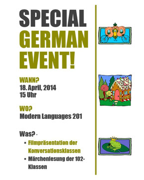 Zunächst haben Abby und ich zu einem German Special Event geladen, wo ich nach einem kurzen Rückblick auf ein nachhaltiges Konversationssemester unseren Film offiziell präsentiert habe und wo wir anschließend unser Märchenbuch präsentiert und jenes Märchen, das wir beide geschrieben haben, vorgelesen haben.
