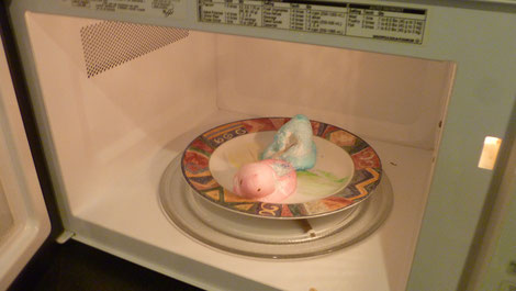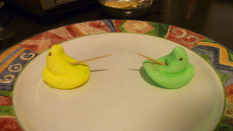 Das sind Peeps und um Ostern ein wenig mehr Spaß einzuhauchen (??) gibt es Wettbewerbe ... zum Beispiel, welches Küken das andere zuerst "ersticht" - in der Mikrowelle. Einfach unglaublich :-)), aber wahr ...